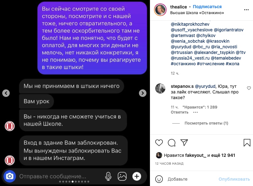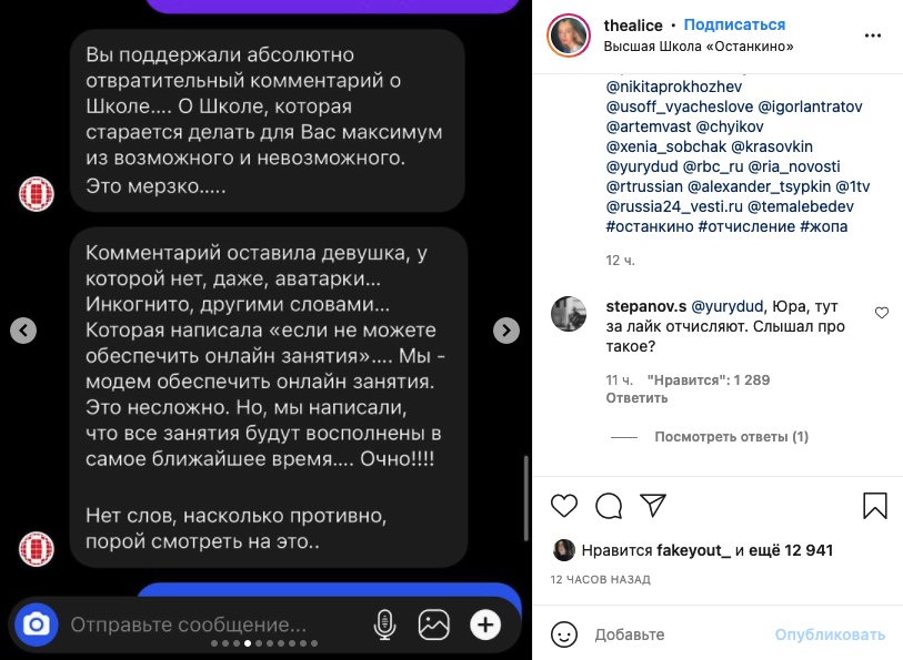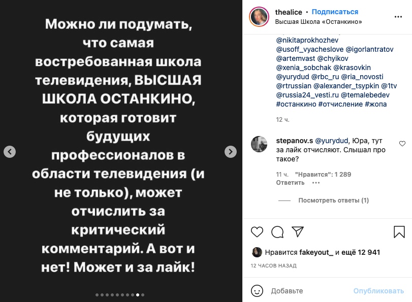 «Можно ли подумать, что самая востребованная школа телевидения, ВЫСШАЯ ШКОЛА ОСТАНКИНО, которая готовит будущих профессионалов в области телевидения (и не только), может отчислить за критический комментарий. А вот и нет! Может и за лайк!» — написала она в своем Instagram.